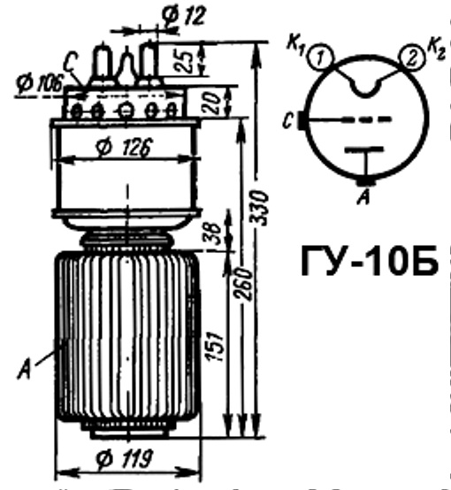 Мощный генераторный триод ГУ-10Б предназначен для работы в качестве усилителя или генератора высокочастотных колебаний на частотах до 25 МГц в схемах с общей сеткой или в схемах с нейтрализацией.