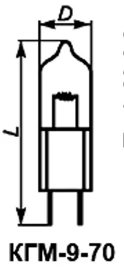КГМ-9-70 лампа накаливания кварцевая галогенная малогабаритная предназначена для использования в качестве высокоинтенсивных источников света в оптических приборах, относится к разделу электровакуумных приборов и ламп различного назначения. По конструкции состоит из вакуумно-герметичной, жесткой оболочки, внутри которой отсутствует кислород.