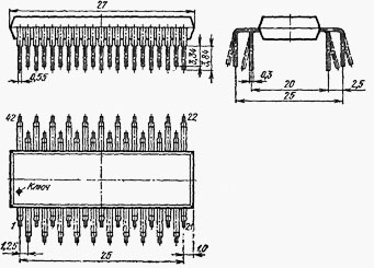 Микросхема представляет собой БИС на основе n-МОП для систем средней производительности.